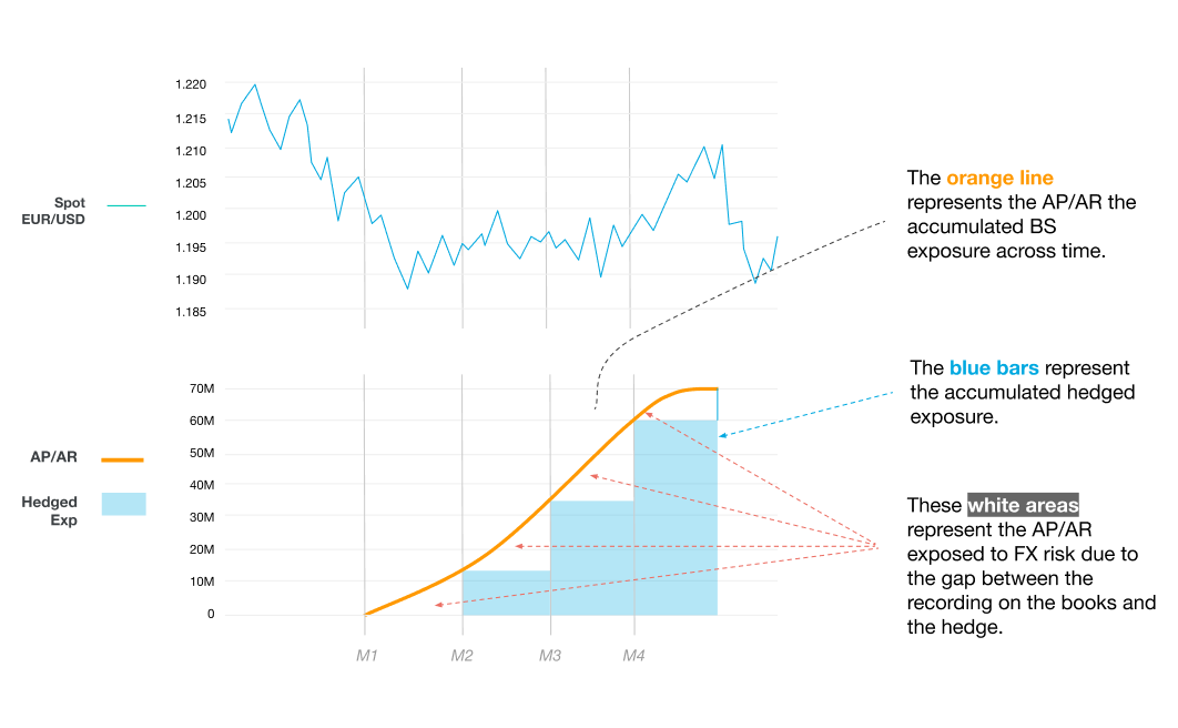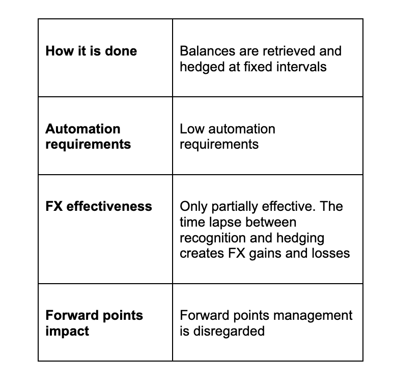 The process is then repeated at one point in the month, usually at the end of the month. The main pitfall of this procedure is easy enough to figure out: there is still a time lapse between the moment the exposure is captured and the corresponding risk mitigation exercise. This results in FX gains and losses, undermining the main goal of the program.