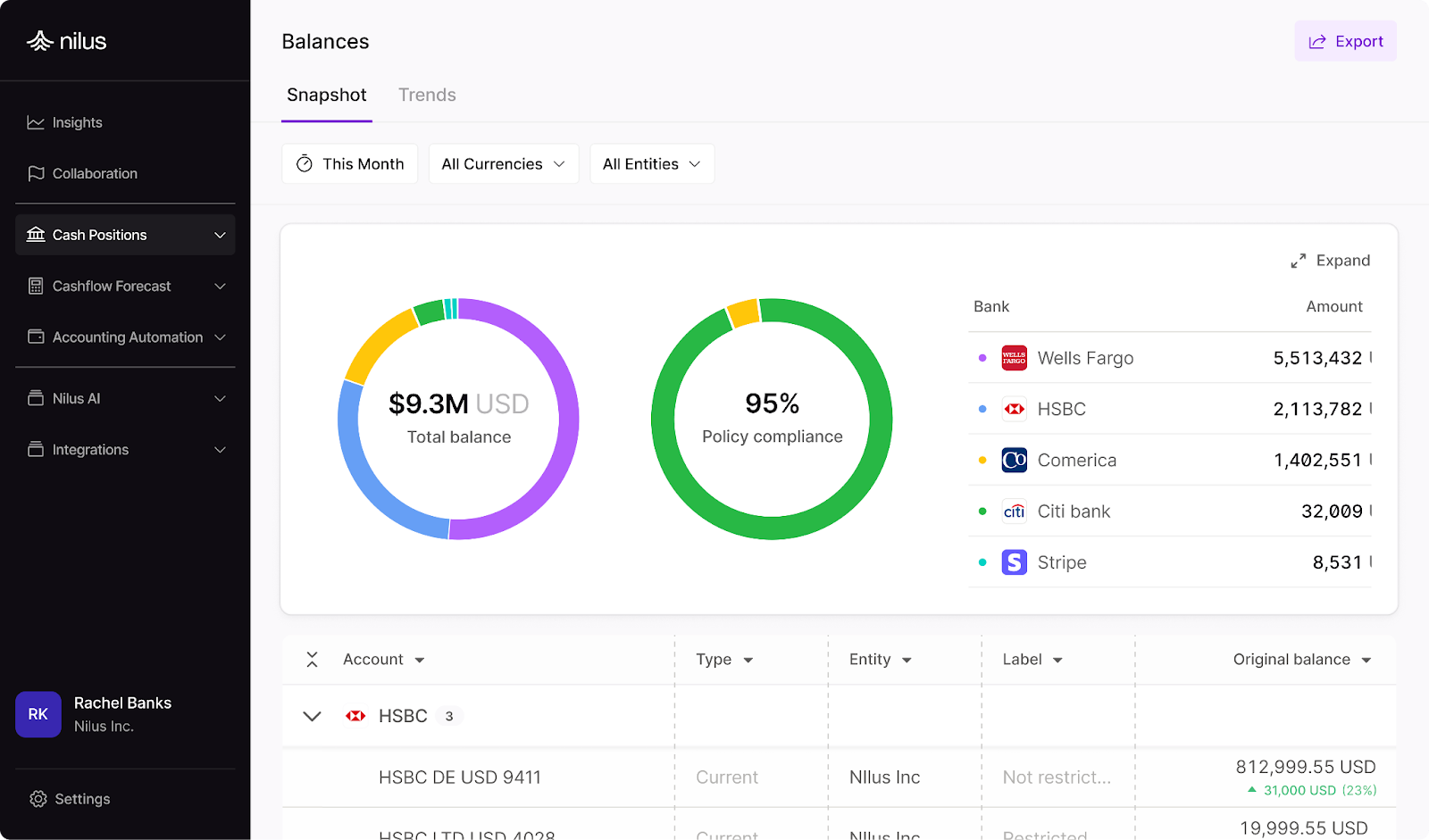Summary views (e.g. total liquidity by region or business unit) and granular slices (e.g. cash by account, currency, or legal entity) should be automated and always up-to-date.