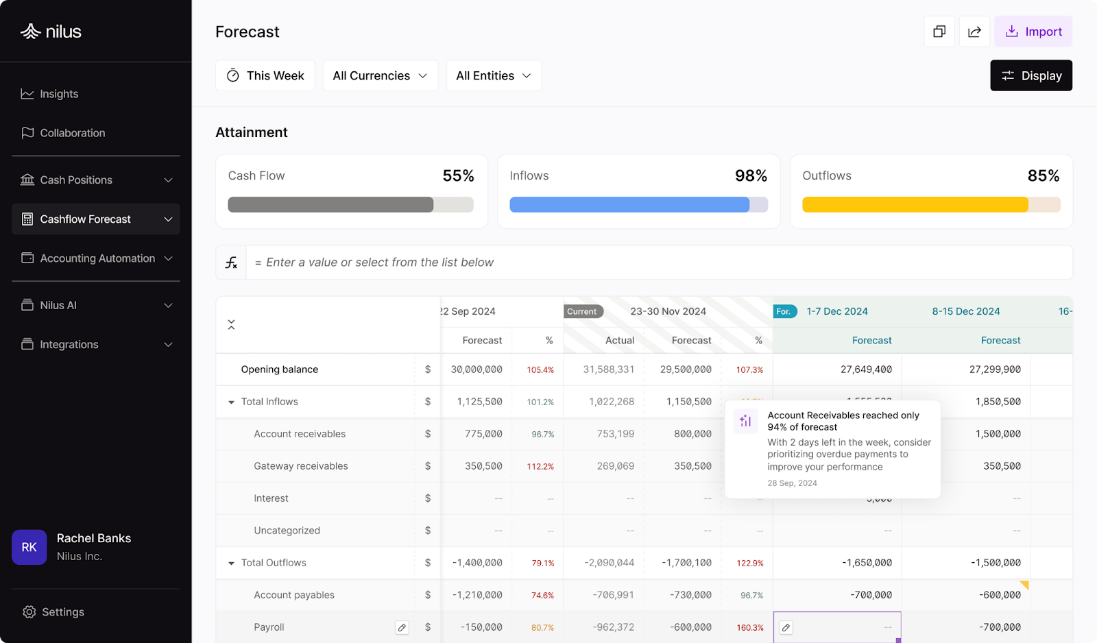 An intelligent cash flow dashboard isn’t just a tool; it’s your frontline defense against financial uncertainty. With Nilus, you get a next-gen, AI-enabled cash flow forecast dashboard that helps you:
