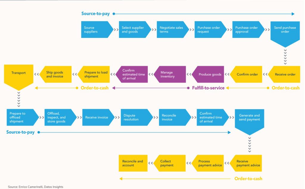 The “snake” model illustrates supply chain flows from sourcing through fulfillment to payment collection. Each segment represents stages where financial services could integrate seamlessly.